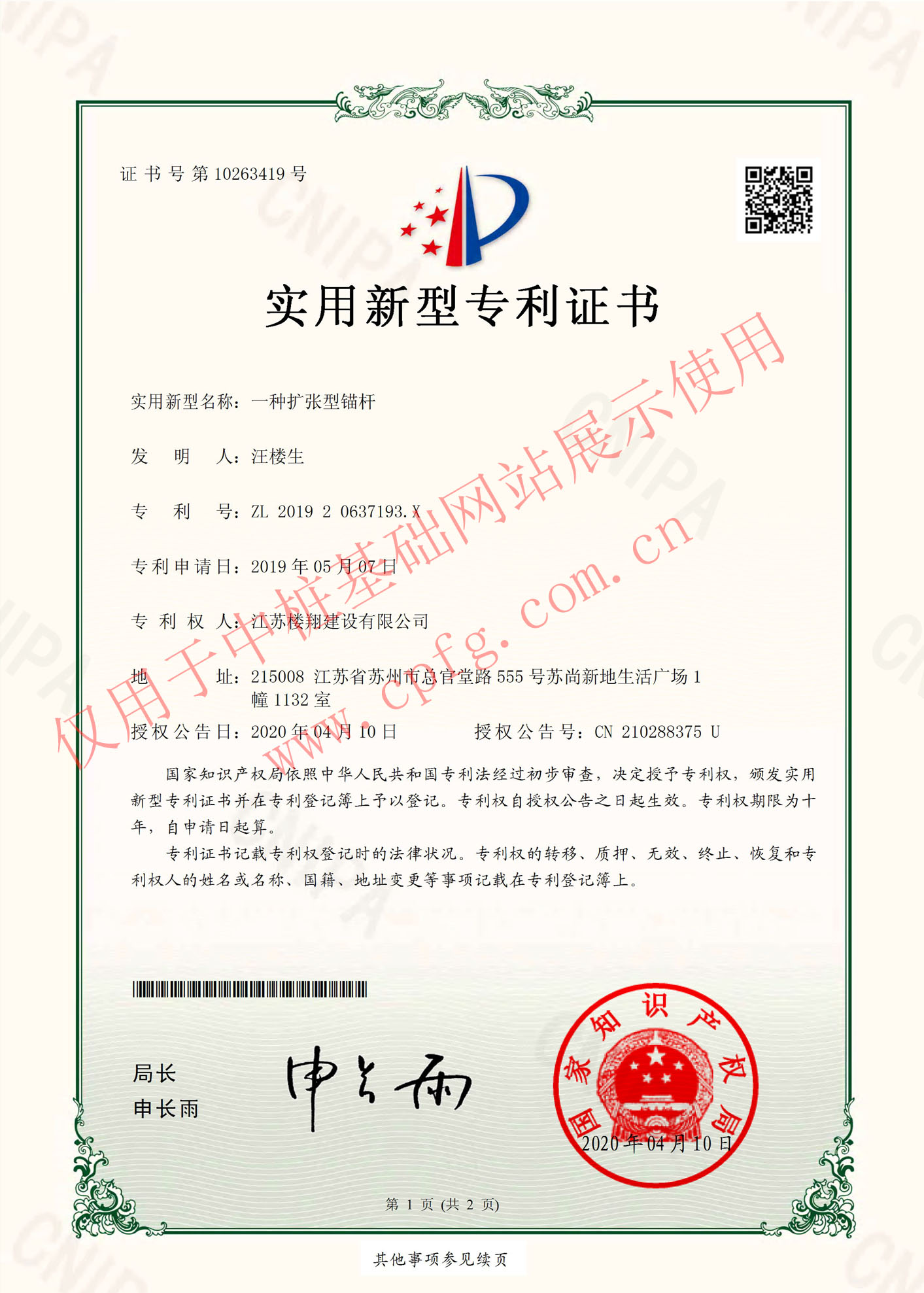 一种扩张型锚杆实用新型专利证书