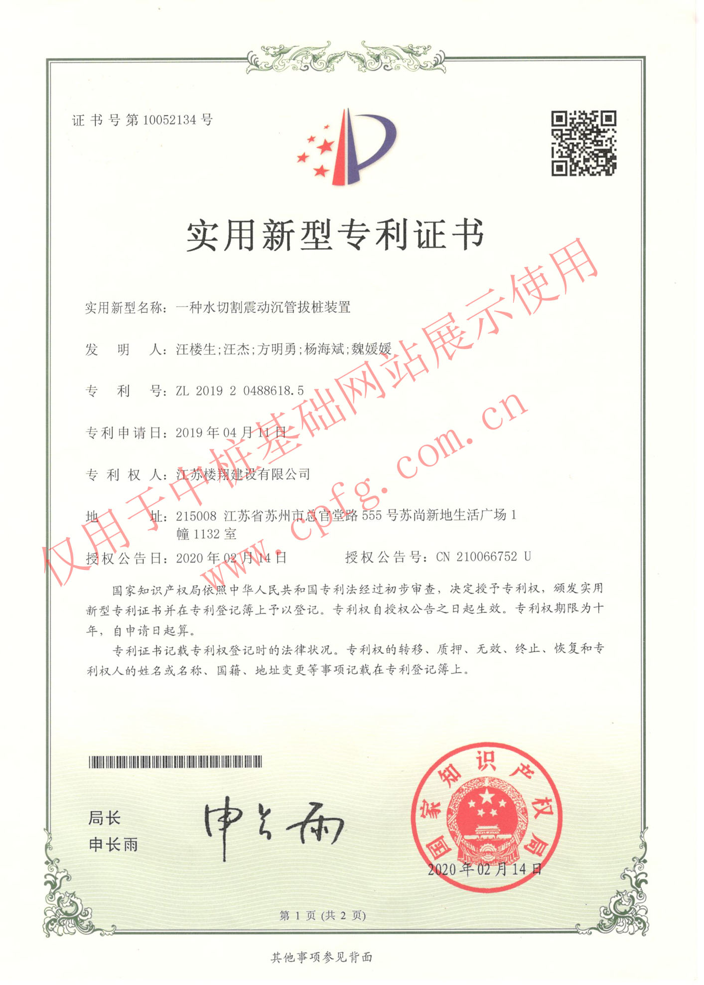 一种水切割震动沉管拔桩装置实用新型专利证书